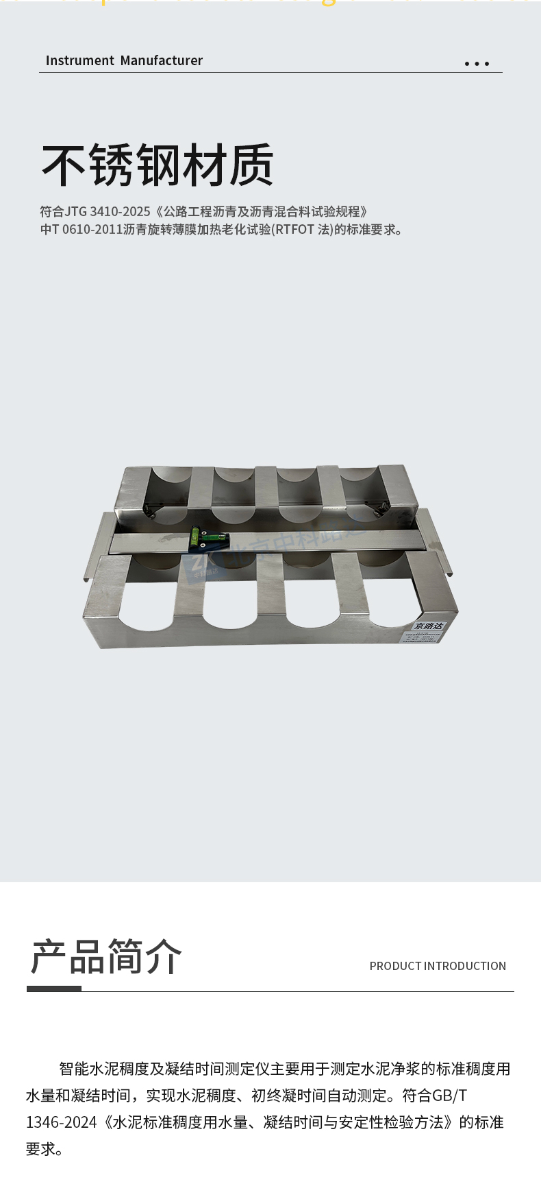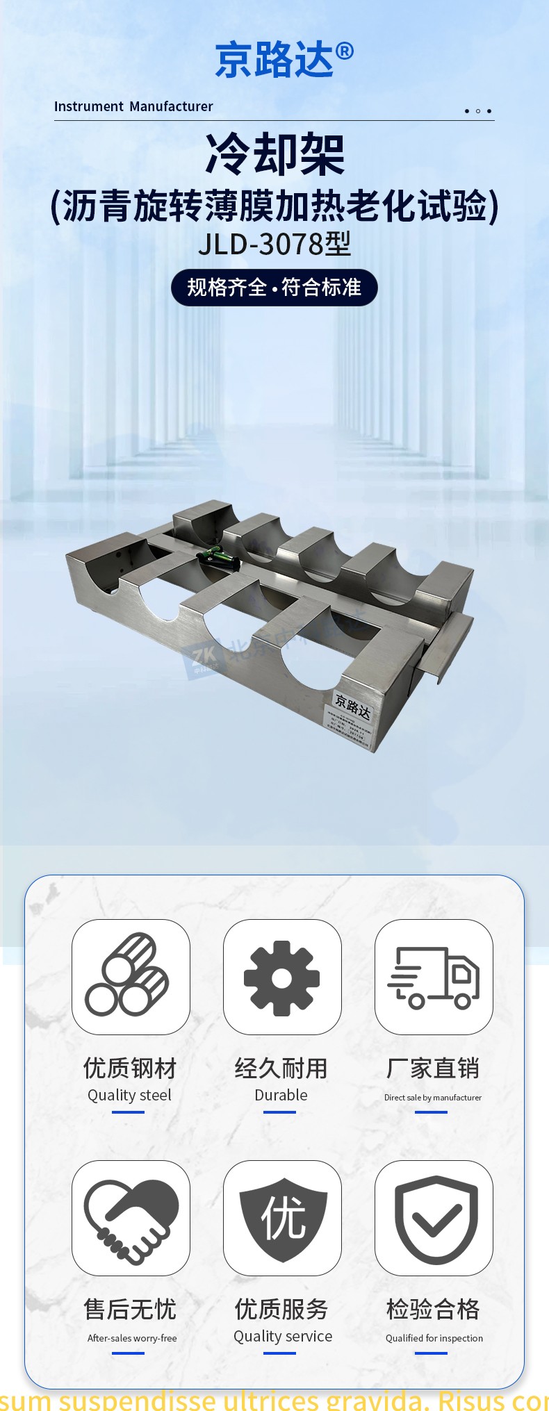冷卻架用于瀝青旋轉薄膜加熱老化試驗時使盛樣瓶水平放置冷卻,由不銹鋼板制成,,每個盛樣瓶都處于同一水平,可使空氣自由地流過瓶子周圍,每個瓶子間及瓶子與任何固體面間的距離不小于25mm。符合JTG 3410-2025《公路工程瀝青及瀝青混合料試驗規程》中T 0610-2011瀝青旋轉薄膜加熱老化試驗(RTFOT 法)的標準要求。